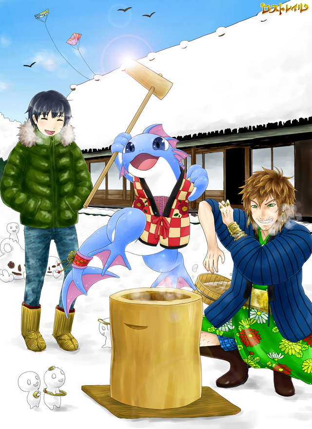 「うわ」 雨戸を開けてみると、外は一面の雪景色だった。 昨晩、すでに降り始めていたから積もるとは思っていた。見渡す限りの白い平野に、点在する古民家の三角屋根。雪は積りに積もっているが、空は快晴だった。 アリオは肌を刺す空気に一気に目覚めた身体を大きく伸ばし、深々と深呼吸をする。 2012年の、元旦だった。 ターミナルでのアリオの誘いに応じてくれたのはふたり。 マグロ・マーシュランドと、ティーロ・ベラドンナだった。 ただし、ティーロは大晦日を含む年末の3日間は壱番世界の某所で用時があるとかで、そのあと合流するということになった。 12月31日。 アリオとマグロがターミナルから壱番世界行きのロストレイルに乗車する。年越し特別便のため、車内はいつになく満員だった。壱番世界では、それぞれの目的地に近い停車場に順々に停車していく。 東京から乗り込んできたティーロは、なぜか派手なグリーンの着流しで、正月番組の落語家というか、奇妙なコスプレめいている。しかも両手いっぱいにアニメ調のイラストが描かれた紙袋を持っていた。 「用事ってコレだったの?」 「なになに~? わ、薄い本がいっぱい!」 ちょっと呆れたふうのアリオに、好奇心に瞳を輝かせるマグロ。 最寄りの停車場まで、えんえんとティーロの好きなマンガの話を聞かされるはめになった。 「お~、おっきーい家だねー。部屋もいっぱーい! ちょっと探検してみてもいいかなー?」 「壱番世界の家ってこんなのか? マンガと違うぞ」 「ちょっと、そんなに慌てなくても……ああ、勝手にひきだしとか開けないで!」 到着してからも、なかなか騒がしい。 アリオが今暮らしている祖父母の家は、この地方の古民家の形式を残したものであった。 マグロはどたばたと部屋から部屋へ走り回っているし、ティーロはことわりもせずに箪笥を開けたり台所の床下収納をのぞいたりしている。 それでも、家まで連れてきてしまえばひと安心だ。 さすがに外は近所の目があって、多少、ドキドキしていたアリオである。 マグロは、 「だいじょうぶだよ。聞かれたら、『アリオ君に街の魚市場で助けられた』ってことにするから」 と胸を張っていたが、かえってごまかすのに苦労するはめになっただろう。 ティーロは人間だが、日本人には見えないので(しかもヘンな服装なので)、これはこれでどんな言い訳にすればいいか、悩みの種だったのだから。 夜は、あたたかな鍋を囲んだ。 マグロが持ってきてくれた昆布で出汁をとり、コタツのうえのテーブルコンロで魚と野菜を煮込んだ。 「お魚おいしそ~」 「たしかにうまそうだが、ともぐいにはならねぇのか?」 「魚とサカナは違うんだよー」 「そういうものなの? さ、煮えてきたよ」 鍋を囲んでいるうちに、テレビの中では大晦日の歌番組が流れている。 「おっ、なんだこりゃ。敵のボスか!」 「違うよ、衣裳だよ。……いや、セットかな?」 「あれに似てる! 『マイティハンク』の「海上油田危機一髪!」に出てきた「獅子舞魔女ガヴリーヌ」に!」 「なにそれ……」 「この人達、綺麗な声してるねー」 「歌手だからね」 「きれいな音楽……。僕も歌う~♪」 メロディにあわせて、マグロが歌いはじめた。 それはどこか――不思議な光景だった。 壱番世界の、畳があって、コタツがあって、テレビがある……そんな茶の間にて、イルカが人に近づいたような獣人の少女と、大柄な壮年の魔術師(ただし目に痛い緑の着流し)と、壱番世界人の少年とが、鍋を囲んでいる。 しらじらとした蛍光灯の灯り。 外はしんしんと降る雪の夜。 柱時計が、大晦日の時を刻む。 それはありうるはずのない幻想のようであり、なにかの物語のようでもあり。 マグロの歌の、そこに秘められたちからのせいかもしれないが、アリオはふいに、胸がきゅっとなるような、せつないような、なつかしいような、不思議な心持ちを抱いた。 「……あれ」 目尻から、ぽろり、と涙がこぼれる。 「なんで、泣いてんだろ、俺……」 理由はわからないが、この夜のことを自分は絶対に忘れないだろう――、そんな気がした。 そして、今朝。 「あけまして、おめでとう」 「なんだって?」 起きだしてきたティーロに、アリオは声をかけた。 「正月の挨拶。モチつきの支度をしなくちゃ。手伝ってもらっていいですか。けっこう重たいんで」 ティーロは長身だし、力仕事も期待できそうだとアリオは思ったのだが、 「おいおい、朝っぱらから、疲れることはかんべんしてくれ。おお、寒い」 ティーロは外の空気にふれて身震いすると、ダメな大人感まるだしでコタツにもぐりこんでしまった。 「ちょ、ちょっと」 「まあ、まて。ものを運べばいいんだろ」 無精髭にまみれた頬をゆるめて、にやり、と笑った。 そのすこしあとに起きてきたマグロは、庭を見て歓声をあげた。 10センチほどの、「人型をした雪」が、あつまってえっちらおっちらと臼を運んでいるさまを見たからだ。 ティーロが雪の精霊のち