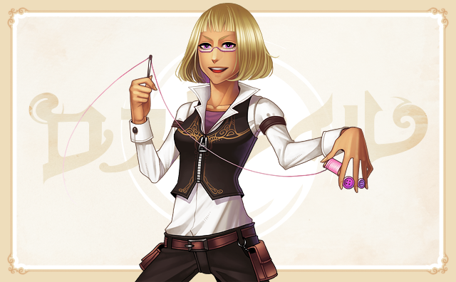 褐色の肌。眼鏡。針・糸・各種鋏・リッパー・ルレット・ボタン・ファスナー等の裁縫道具を入れたベルトポーチを装着。